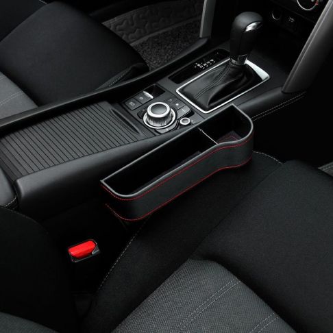 Designed to universally fit any vehicle, this multifunctional sidekick will keep all your daily essentials and must-haves in place. Our Multifunctional Car Seat Organizer features a coin holder, curved spot to hold a tumbler or drink, and even built-in ports to facilitate flow of charger cables for devices. Plus, a luxe black, expert-crafted PU leather design (with visible red stitching detail) adds a stylish touch that blends into just about any car interior. Above all, our organizer is easy to install: just insert into the space between your seat and center console — no drills or attachment clips required. It’s a high-crafted solution to help tidy up your ride.